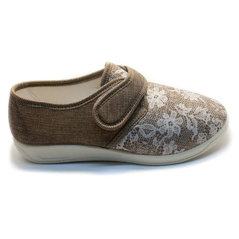 Ce chausson confortable pour femme est disponible en couleur cappuccino et de la pointure 35 à 42.