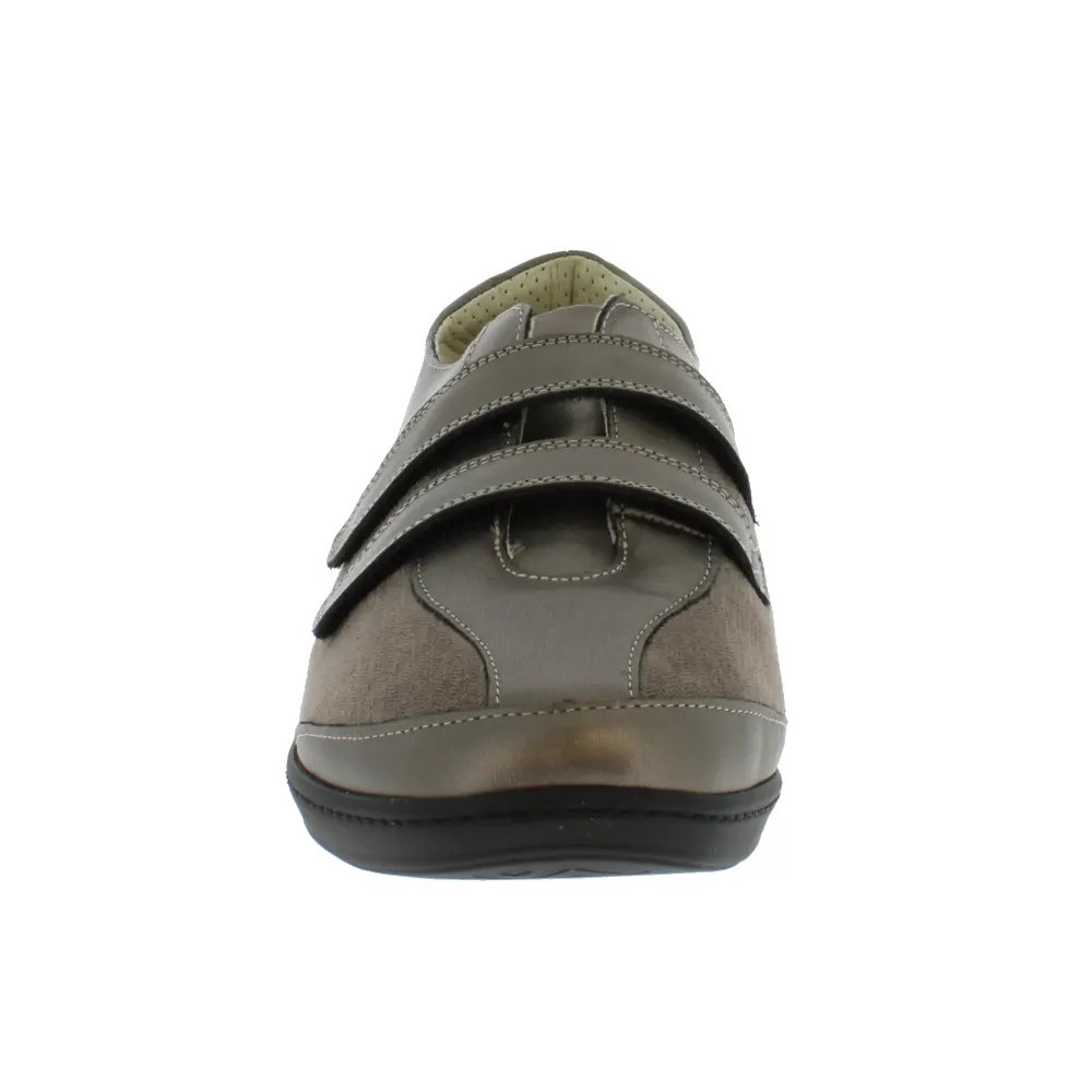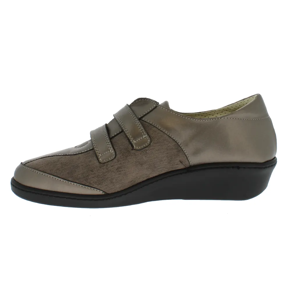 La Stina Bronze de Podowell est une chaussure de ville respirante dotée de deux zones latérales entièrement extensibles pour s’adapter aux pieds souffrant d’hallux-valgus ou de quintus varus. Les deux brides assurent une grande ouverture de la chaussure, facilitant ainsi le chaussage et l’ajustement de la chaussure au pied. La semelle grande stabilité de cette chaussure hallux valgus offre une zone de contact au sol importante, une souplesse de l’avant-pied et un bon maintien lors de la marche.