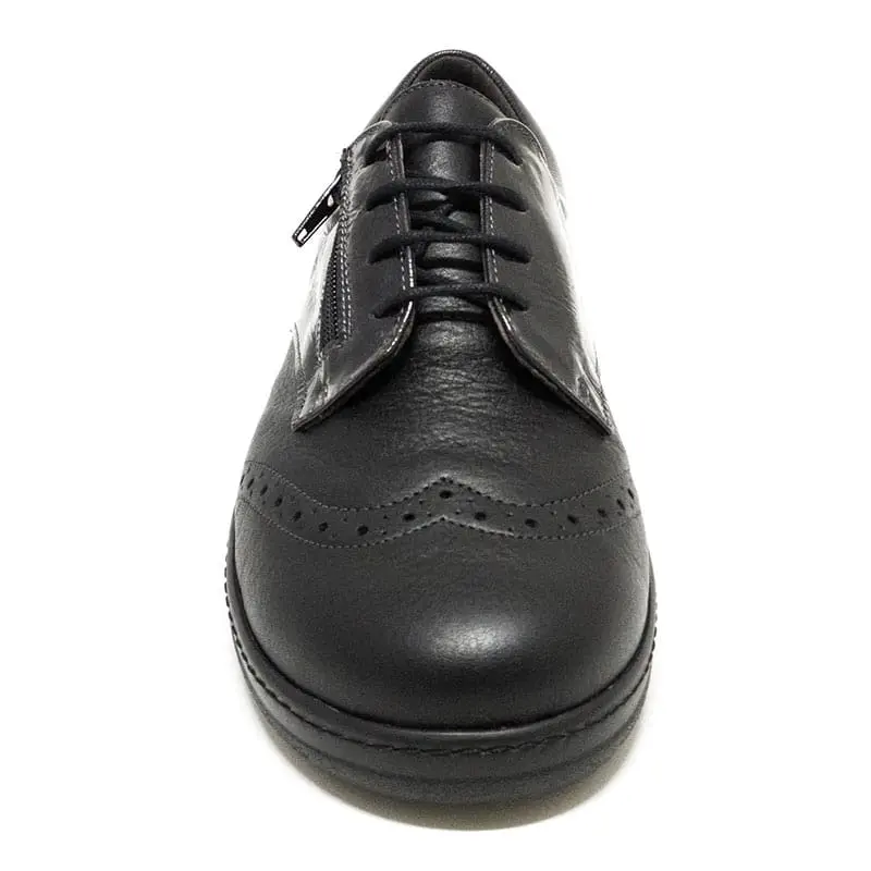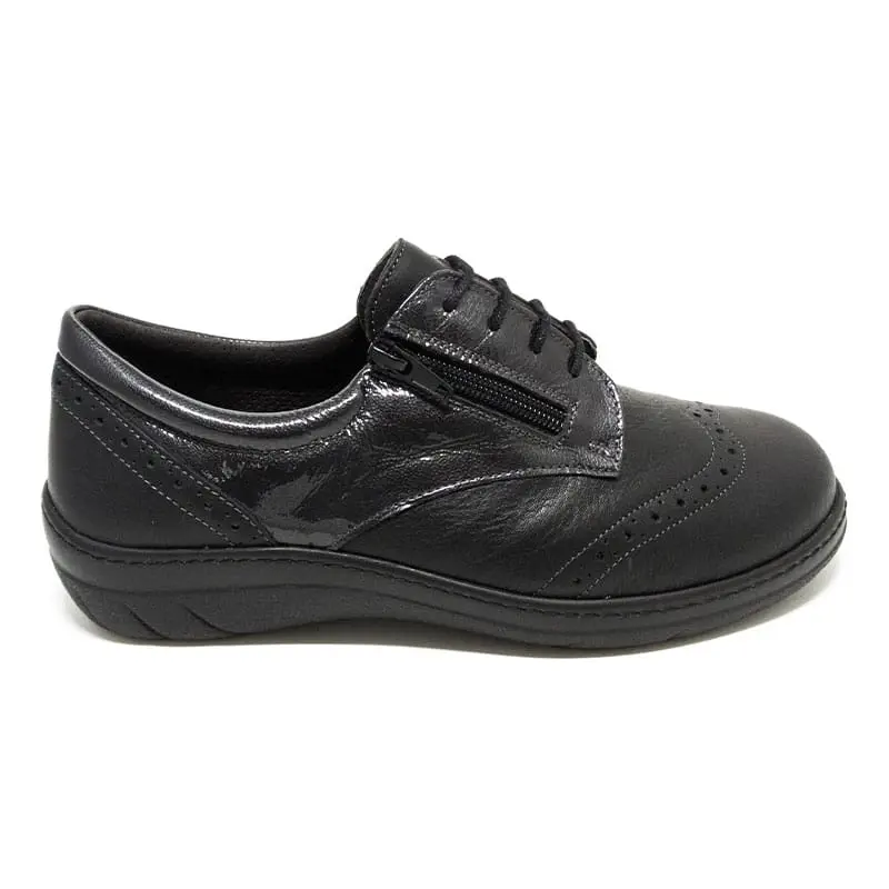 Élégante avec sa touche de cuir verni, ce modèle a été spécifiquement développé pour s’adapter aux pieds diabétiques. La doublure ON STEAM® évacue l’humidité et la mousse haute densité limite les frottements et les zones de surpression. Associée à une semelle antidérapante légèrement débordante, elle protège le pied vis-à-vis des éléments extérieurs et prévient ainsi l’apparition de lésions. De plus l’association du lacet et de la fermeture à glissière permettra un chaussage facile et précis au quotidien.