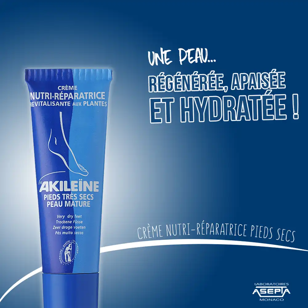 La Crème Nutri-Réparatrice Revitalisante aux Plantes Akileïne® assure une hydratation durable et intense. Elle répare les fissures et crevasses et protège le capital jeunesse de la peau grâce à l’IPARZINE®-4A (actif breveté exclusif des Laboratoires ASEPTA). Résultats : la peau est plus belle, régénérée, apaisée et parfaitement hydratée.