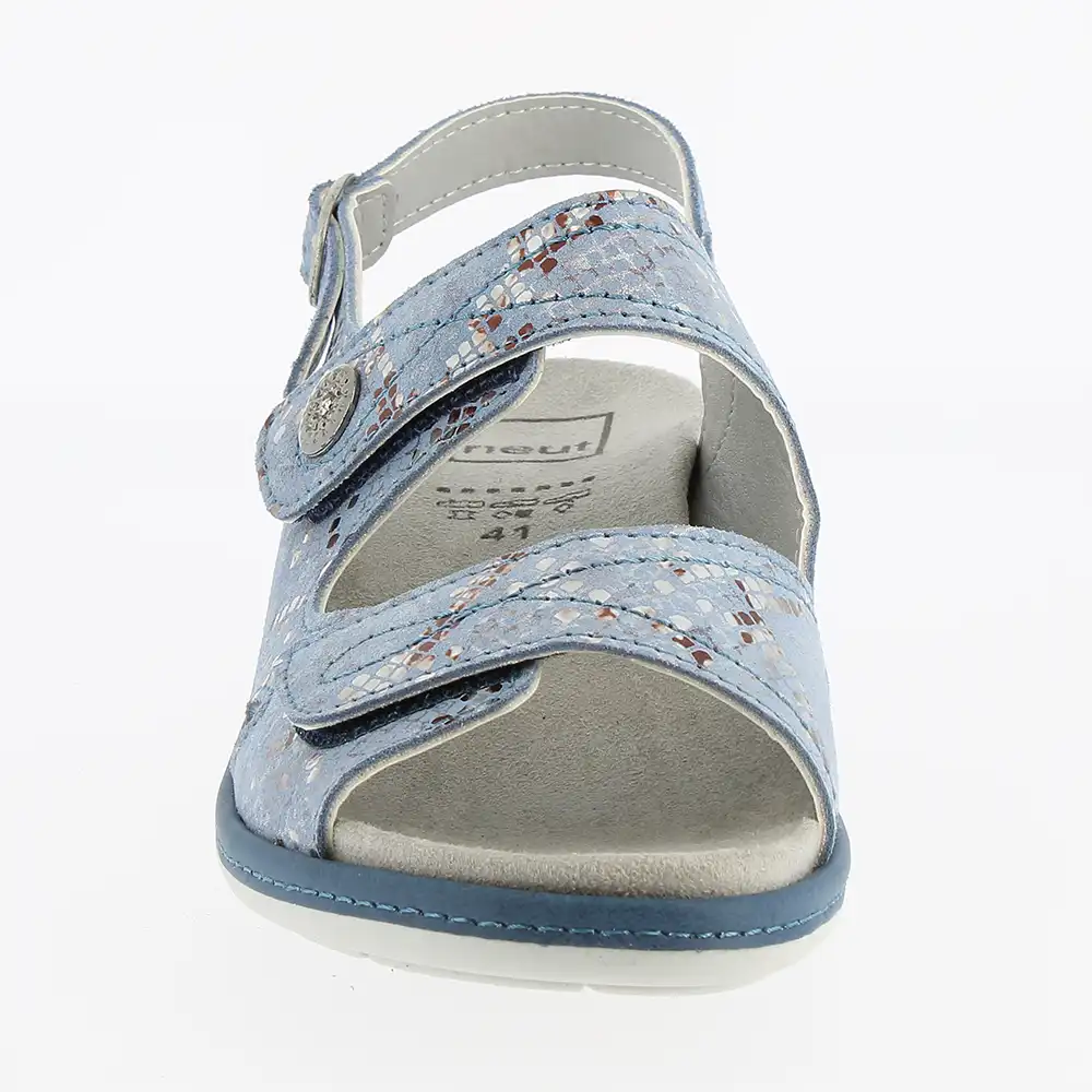 La sandale Neut Vogue en couleur bleu est une sandale orthopédique créée pour les pieds sensibles. Avec sa faible cambrure, elle soulagera votre avant-pied. La petite bride postérieur réglable permettra un meilleur maintien du talon. La semelle interne est amovible et on retrouve des pastilles velcros pour pouvoir adapter vos semelles orthopédiques dans la sandale.