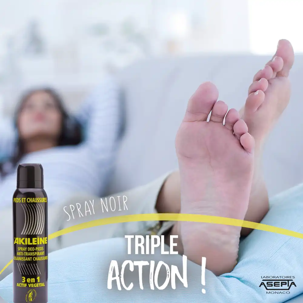 Le Spray Pieds & Chaussures Akileïne® est doté d’une triple action pour le confort du pied. Il le désodorise efficacement pour éviter les mauvaises odeurs. Aussi regule-t-il la transpiration excessive conduisant à la macération. Sa composition en fait également un ennemi du développement microbien et fongique.